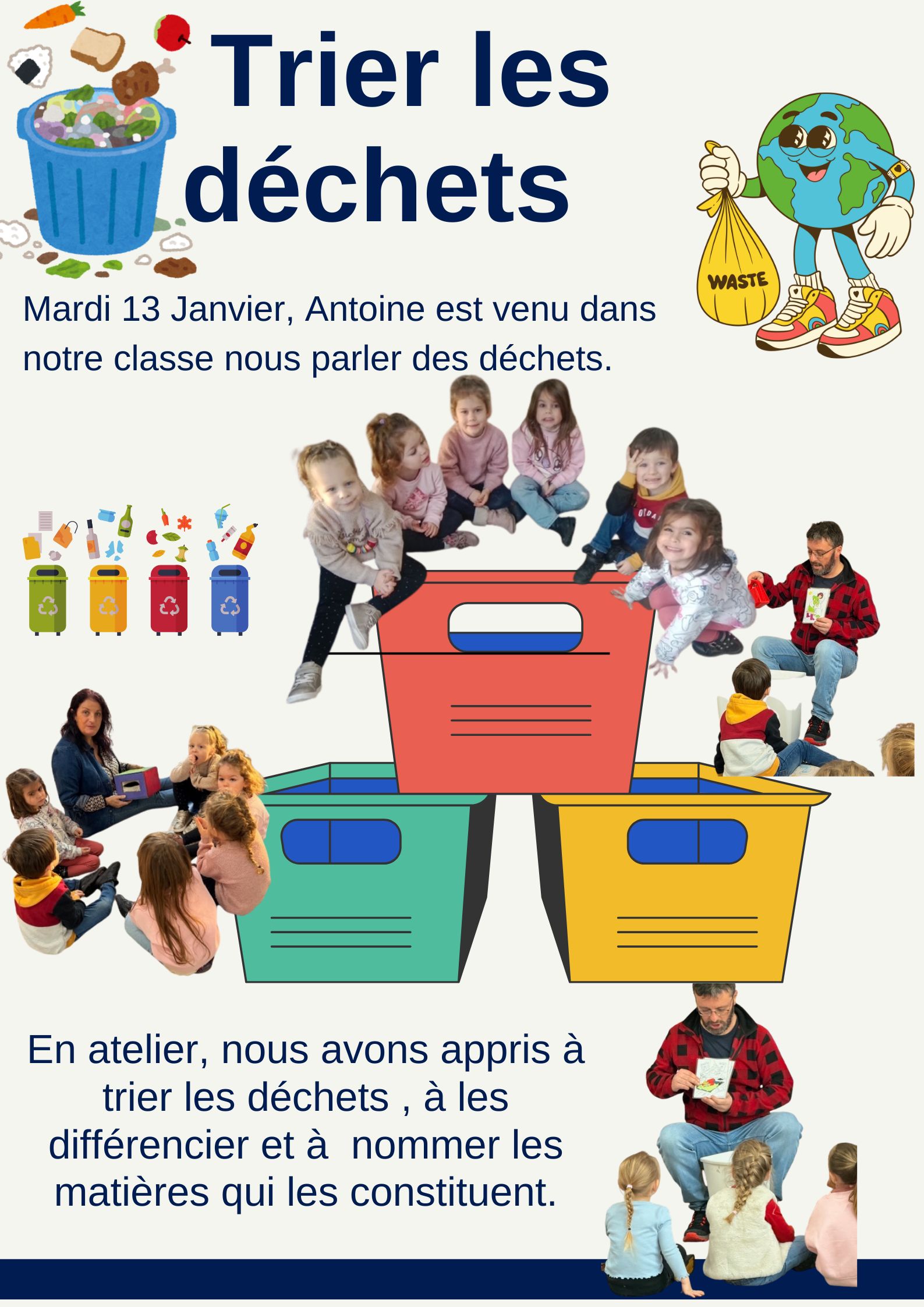 By carole caherec13 janvier 2026PS/MS Mardi 13 Janvier, Antoine ( CPIE) est venu dans notre classe pour nous sensibiliser au tri des déchets et plus particulièrement pour nous aider à différencier les déchets en fonction de leur matière ( papier, coton, verre, plastique, métal).